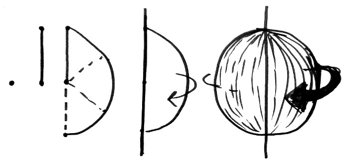 Así, la esfera surge de un punto central relacionado con otra serie de puntos EQUIDISTANTES a ese centro, que dibujan una curva (y conforman un plano), que se revoluciona en torno a una RECTA DIRECTRIZ y su parte interior se denomina BOLA CERRADA. La esfera es una figura perfecta, sin aristas, ni conflictos, ni anomalías. Un espacio sometido al centro, en el que la REVOLUCIÓN deja claro su significado habitual, que no es el de proceso de transformación, sino el de repetición acelerada de una misma cosa.