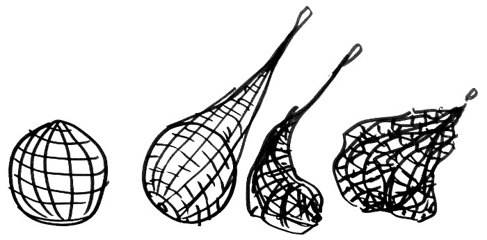 La parte exterior de la esfera, la superficial y pública se organiza mediante paralelos y meridianos que conforman cuadrículas. Esa cuadrícula está formada por una multitud de nodos que dibujan trama, una red. Una red que podría ser esa que sirve para guardar la pelota. Una red que puede acoger distintos contenidos, adoptar distintas formas, proponer diversas relaciones abiertas, descentralizadas, distribuidas y multidireccionales, y niveles de (des)articulación e (inter)dependencia entre nodos.