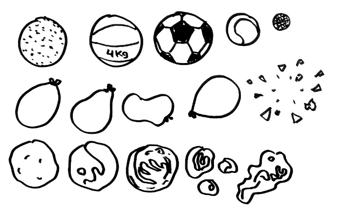 • Bola de plastilina: irregular, dúctil, fácilmente mezclable (no así el deshacer la mezcla), propicia para jugar e imaginar.