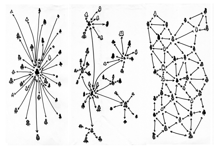 Frente a las redes centralizadas, una red P2P (peer-to-peer) es una red de pares. Una red compuesta por una serie de nodos que se comportan como iguales entre sí -es decir, actúan simultáneamente como clientes y servidores respecto a los demás nodos de la red-. Pero además de esto, el P2P es toda una filosofía sobre un cambio de paradigma en la manera de organizarnos-compartir-producir en red, de forma distribuida, conectando personas e iniciativas en plazas, parques, oficinas, barrios, pueblos… Una apuesta por la apertura, la descentralización y el empoderamiento colectivo, que tiene su reflejo en toda una emergente y diversa tipología de iniciativas, que van desde nuevas formas de producción y consumo, hasta formas de gobierno transparentes y horizontales, pasando por el diseño participativo de procesos sociales, o el intercambio de archivos digitales y la transferencia de conocimiento libre.