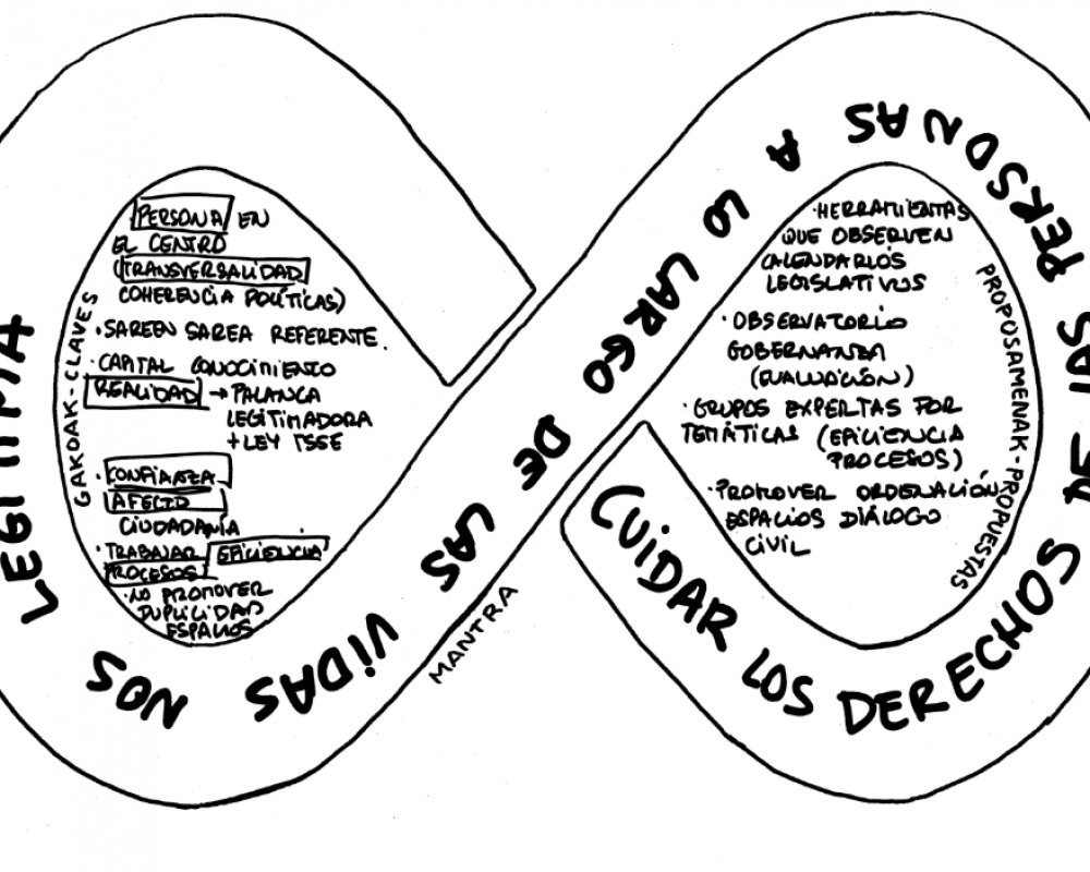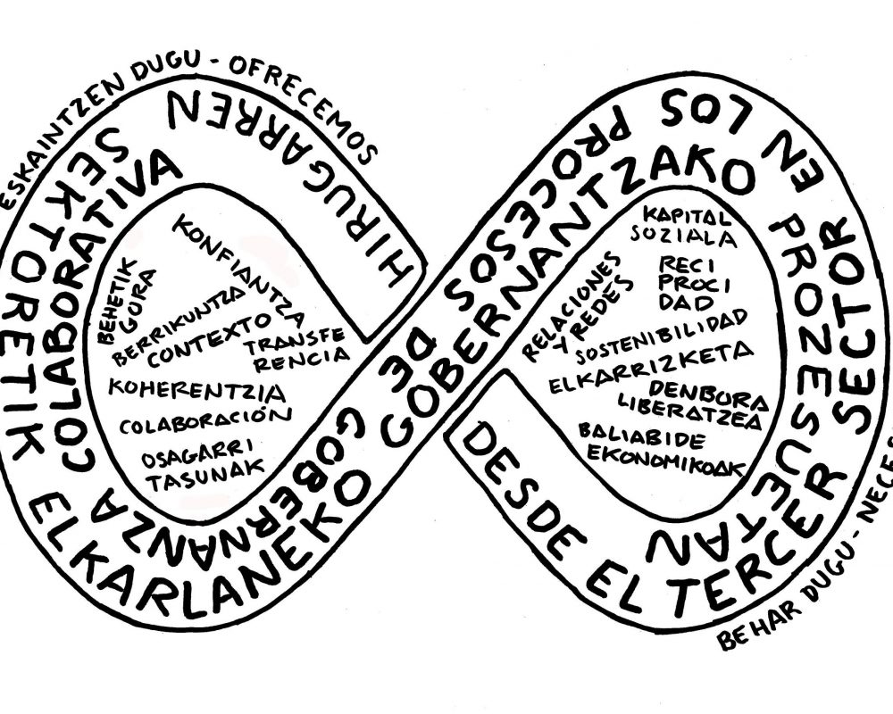 Dos meses antes a la celebración del acto, desde ColaBoraBora se ha diseñado y acompañado un proceso de reflexión y trabajo conjunto llevado a cabo por las redes de Sareen Sarea para construir juntas mensajes claves para el discurso común. Este proceso de reflexión colectiva ha tenido dos fases: la primera ha consistido en concretar e identificar los conceptos claves que se quiere destacar desde el Tercer Sector Social de Euskadi en los procesos de Gobernanza Colaborativa (colaboración público – social); y en la segunda fase, a través de una sesión participativa, se han profundizado y reflexionado cada uno de los conceptos obteniendo mensajes claves para crear un posicionamiento conjunto.