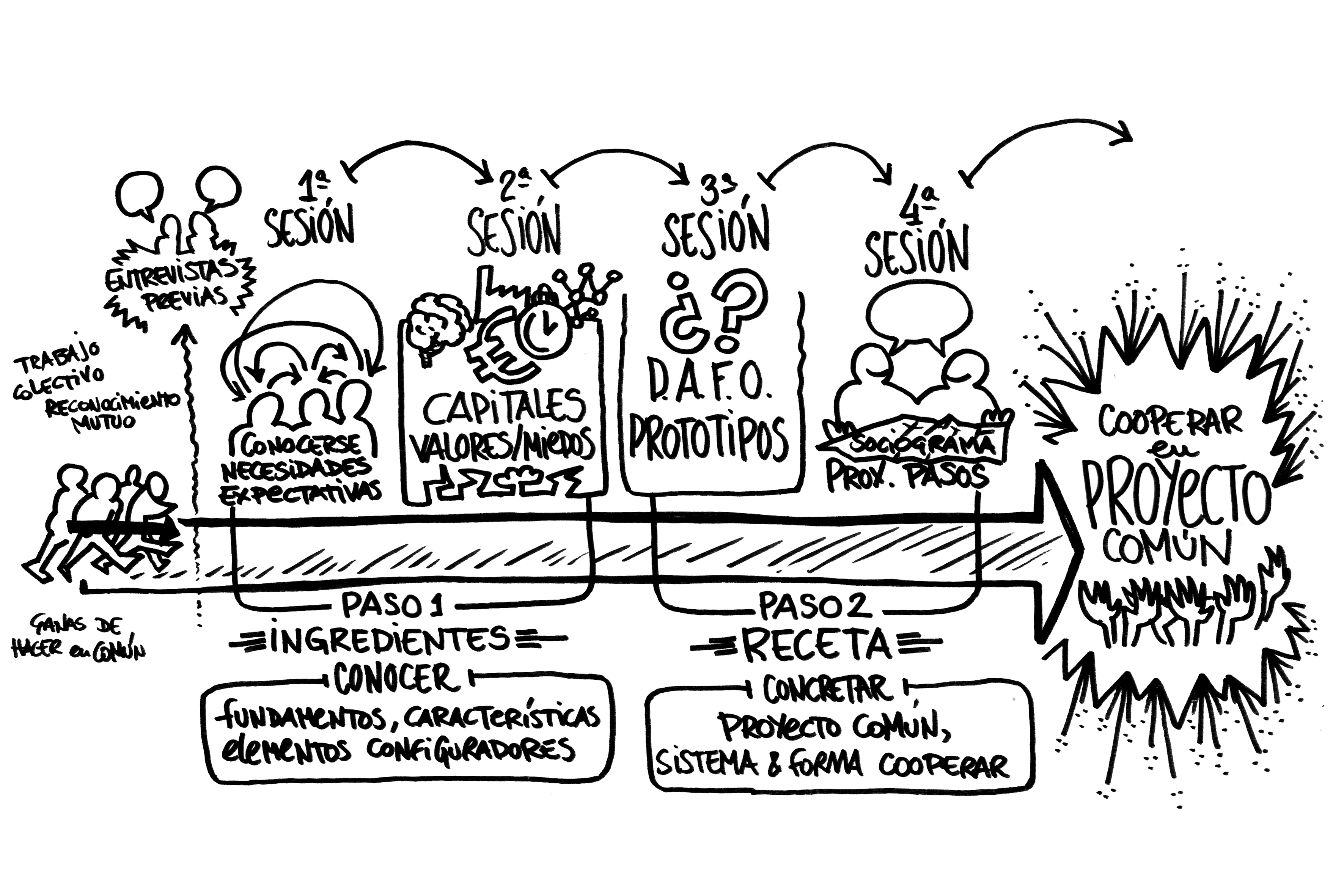 Utilizando la metáfora del cóctel, jugando con la combinación de ingredientes. A través de un proceso centrado en los preliminares de la colaboración y en poner las bases para trabajar juntas, desde el (re)conocimiento mutuo, la definición de un proyecto común y el trabajo colectivo.